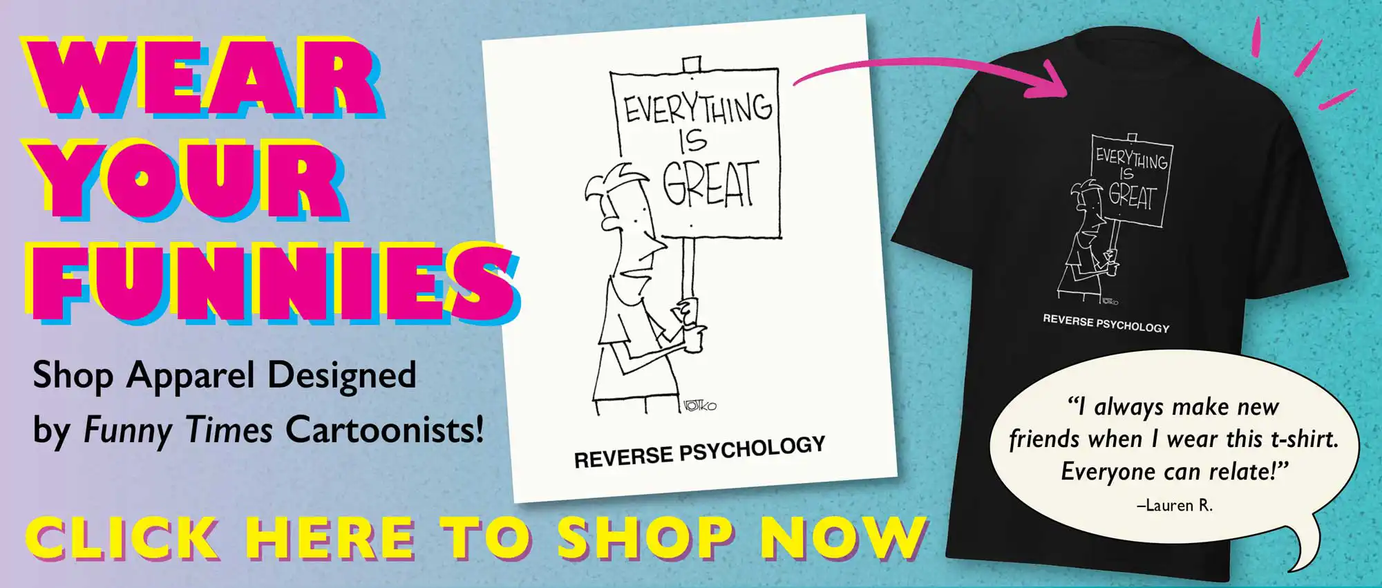 If something arrives damaged, send a photo of the damaged goods to support@printful.com and cc: info@funnytimes.com. We’ll gladly send a replacement at no cost to you.